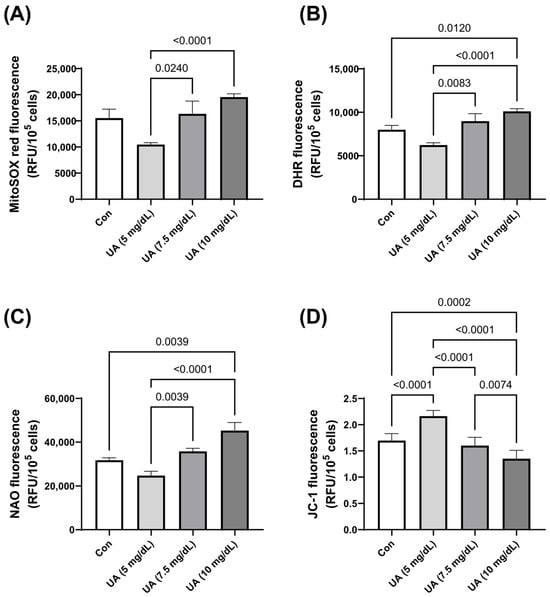 Effect of varying concentrations of exogenous UA on HUVEC oxidative stress-related parameters. Significant alterations were noted in the levels of (A) mitochondrial superoxides, (B) cellular peroxides, (C) mitochondrial mass, and (D) mitochondrial membrane potential. The data are presented as mean ± SD.