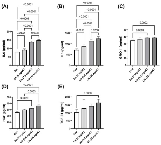 UA-induced secretion of (A) IL-6, (B) IL-8, (C) GRO-1, (D) HGF, and (E) TGF-β1 by HUVECs. The data are presented as mean ± SD.