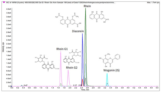 The method developed in this study was designed to be highly specific, sensitive, and reliable for the simultaneous quantification of Rhein, Rhein-G1, and Rhein-G2 in plasma samples. To the best of our knowledge, this is the first analytical technique that enables the concurrent quantification of these metabolites. A representative chromatogram illustrating the multiple reaction monitoring (MRM) of Rhein and its metabolites spiked in rat plasma is provided in Figure 1. The retention times for diacerein, Rhein, Rhein-G1, Rhein-G2, and the internal standard (wogonin) were 2.4, 2.5, 1.7, 1.9, and 3.3 min, respectively.