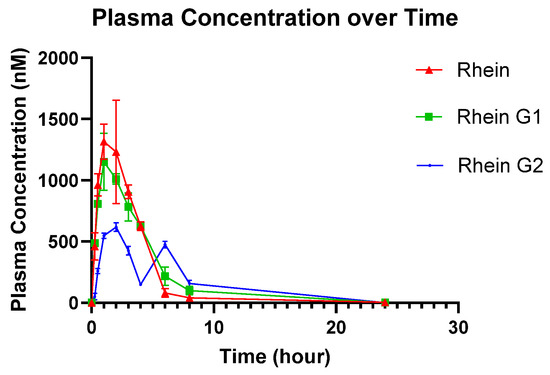 Plasma concentration versus time profiles of the Rhein, Rhein-G1, and Rhein-G2 after oral administration of diacerein (50 mg/kg). Each symbol represents the mean and the error bars indicate the S.D. (n = 5).