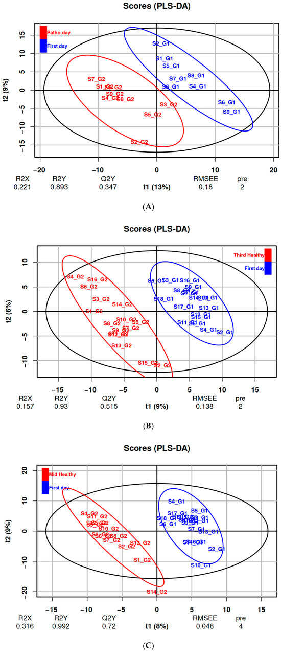 (A) PLS-DA score plot for the model investigating the effects of respiratory illnesses, comparing their first training camp day (blue) and the day they declared symptoms (red) (DS1). (B) PLS-DA score plot investigating the effects of training and hypoxia, comparing their first training camp day (blue) and the third one (red) (DS2). (C) PLS-DA score plot investigating the effects of training and hypoxia, comparing their first training camp day (blue) and the eighth one (red) (DS3).