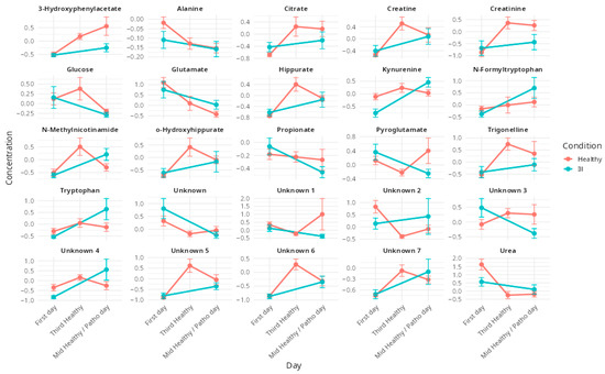 Mean metabolite concentration over time for healthy (red line) and ill (blue line) individuals. Each subplot corresponds to a specific metabolite, with error bars indicating the standard error of the mean, showing their evolution between the first training camp day (First day), the third training camp day (Third Healthy) and the eighth day or the day of symptoms occurrence (Mid Healthy/Patho day). Differences in trends between conditions highlight potential biomarkers.