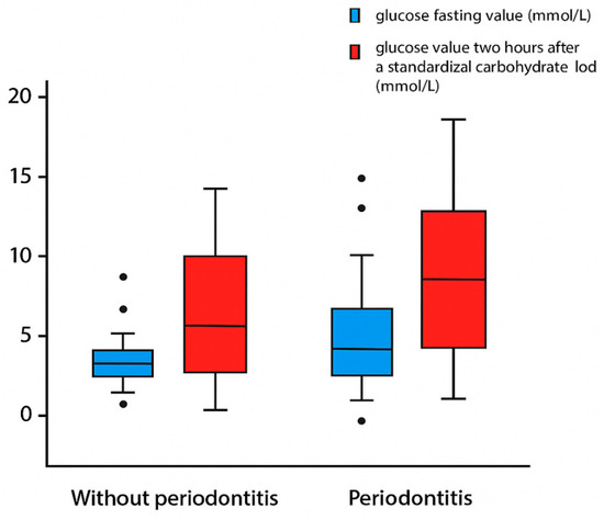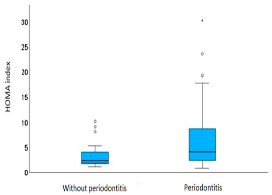 The dynamics of glucose after challenge on the 2 h oral glucose tolerance test (fasting glucose values—mmol/L 6.06 ± 1.10 vs. 7.31 ± 2.32, p = 0.016—and glucose values 2 h after standardized carbohydrate load—mmol/L 8.02 ± 3.48 vs. 10.78 ± 4.28, p = 0.005) and differences in the HOMA index (3.58 ± 2.61 vs. 6.38 ± 5.74, p = 0.012) depending on the existence of periodontitis are shown in Figure 1 and Figure 2.