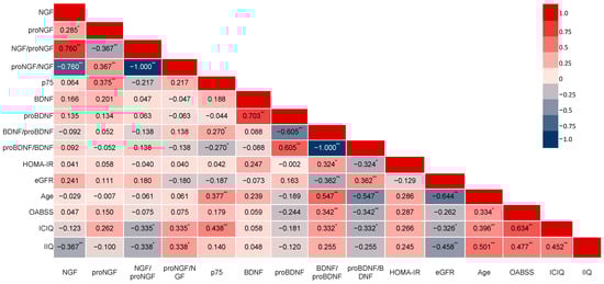 Results adjusted to covariates maintained similar trends, emphasizing a relationship between aging, renal function, metabolic disturbances, and neurotrophin imbalance in the context of OAB.