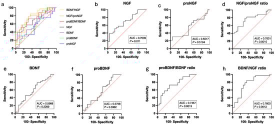The receiver operating characteristic (ROC) analysis using the Wilson/Brown method was performed comparing control versus OAB cohorts at baseline measurements. (a) Ensemble area under the curve (AUC) analysis of urinary biomarkers. (b–h) Individual AUC analysis of each biomarker tested, including (b) NGF, (c) proNGF, (d) NGF/proNGF, (e) BDNF, (f) proBDNF, (g) proBDNF/BDNF, and (h) BDNF/NGF ratio.
