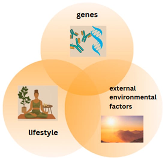 Many diseases are caused by interactions between genes and environmental factors (such as diet). This relationship is the subject of nutrigenomics, which attempts to answer the following question: How does the composition of food, through changes in the expression and/or structure of the genome, influence the state between health and disease and, at the same time, to what extent does the individually diverse genome enable food components to affect health? Human health, therefore, is determined by several factors, which include environment, lifestyle and genetic factors (Figure 1). Lifestyle includes diet, physical activity, stress levels and rest.