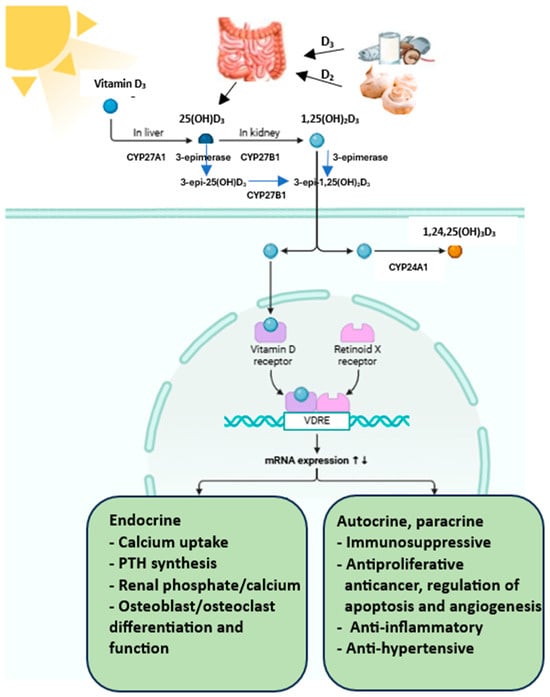 Vitamin D is a steroidal chemical that plays an important role in calcium homeostasis in the body. In addition, this vitamin is known to have a broad spectrum of action in various extraskeletal pathways. An adequate level of 25-hydroxyvitamin D (25(OH)D) in the body contributes to maintaining normal body weight and prevents obesity [9,10]. It regulates the immune system, participates in the detoxification of bile acids and plays a significant role in intestinal homeostasis. Vitamin D is one of the key controllers of systemic inflammation, oxidative stress and mitochondrial respiratory function, and thus, the human ageing process [11]. The molecular and cellular actions of 1,25 dihydroxyvitamin D (1,25(OH)2D) slow down oxidative stress and cell and tissue damage. On the other hand, vitamin D deficiency impairs mitochondrial function and increases oxidative stress and systemic inflammation [2]. The interaction of 1,25(OH)2D with its intracellular receptors modulates vitamin D-dependent gene transcription and activation of vitamin D-responsive elements, which triggers multiple second messenger systems [11]. The main causes of vitamin D deficiency include insufficient exposure to sunlight, a diet low in vitamin D-rich foods and lack of supplementation. In addition, certain medical conditions—such as intestinal, liver or kidney diseases—may impair the absorption and metabolism of vitamin D, further contributing to deficiency in specific patient groups. Hypovitaminosis D resulting from malabsorption or insufficient metabolism appears to generate the development of many diseases related to the skeleton, i.e., rickets and osteomalacia, as well as conditions affecting the central nervous system and other organs, including neurodegenerative and psychiatric diseases, autoimmune, cardiovascular, metabolic disorders and some cancers [12,13,14,15]. Understanding vitamin D-related advances in metabolomics, transcriptomics and epigenetics may provide better clinical outcomes in humans.