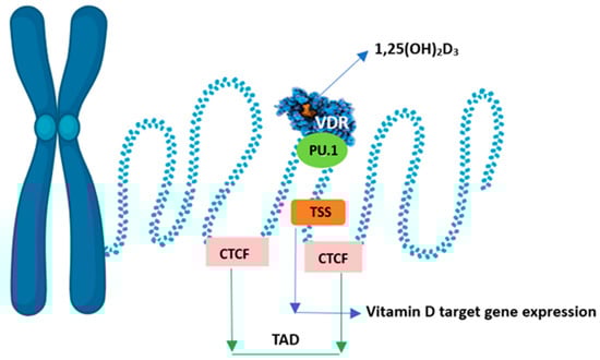 The conformational change of the VDR-RXR dimer also releases corepressor proteins that mobilise histone deacetylases and DNA methyltransferases. This leads to strong chromatin condensation and blocks the promoter sequence of the gene in question, preventing access to transcription factors. These coregulators differ in their target tissue distribution and their specificity of action towards both 1,25(OH)2D and VDR. This leads to local changes in chromatin accessibility at multiple genomic sites, i.e., the epigenome responds to vitamin D. Chromatin accessibility is the main epigenetic determinant controlling gene expression [47]. The expression of the primary vitamin D target gene is modulated. An increase is observed chiefly when it co-occurs with a primary VDR-binding site within the same higher-order chromatin structure (topologically associated domain, TAD). In addition, the transcription start site (TSS) of the vitamin D target gene and the VDR-binding enhancer region must be within accessible chromatin. The genomic region that can be affected by VDR-binding calcitriol is limited by the CTCF proteins defining the left and right borders of the TAD. Hence, only vitamin D target genes within the TAD will be stimulated to produce more mRNA copies (Figure 5). CTCF is the main protein in the organisation of chromatin into active and inactive regions, but only 15% of CTCF sites in the whole genome are used to form TAD anchor regions. The pioneer factor, i.e., PU.1, is a transcription factor that acts as the first enhancer by binding proteins that interact with chromatin-remodelling enzymes and is thus more accessible to, for example, the VDR [72].