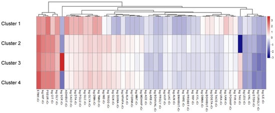 We stratified the study population into metabolite clusters to explore potential differences in their associations with dietary behavior. No significant difference in age distribution was observed across clusters. However, participants significantly differed by sex (p < 0.001), with Cluster 3 having the highest proportion of males (67.86%), followed by Cluster 4 (44.22%). Conversely, the highest prevalence of females was observed in Cluster 1 (80.00%), followed by Cluster 2 (78.57%) and Cluster 4 (55.78%) (Supplementary Table S1). In addition to demographic differences, clusters exhibited significant differences in metabolic and dietary parameters, most notably in HDL cholesterol levels (p = 0.027), protein intake (p = 0.019), fat consumption (p = 0.032), and total energy intake (p = 0.033). Cluster 3 consistently showed higher energy intake, while Clusters 1 and 2 exhibited a significantly lower mean energy intake. In addition, processed meat consumption was significantly higher in Cluster 3 compared to Cluster 1, Cluster 4, and Cluster 2 (p = 0.002). Concerning metabolites, the strongest differences between clusters were identified for urinary sucrose and taurine levels, as illustrated in the heatmap in Figure 1. Cluster 1, which contained only 10 participants, was characterized by, e.g., higher levels of 2-hydroxyisobutyrate, cis-aconitate, 4-deoxythreonate, pyroglutamate, or glucose and lower levels of indoxyl sulfate, trigonelline, glutamine, and quinic acid, when compared to Clusters 2, 3, and 4. Significant differences across the remaining three clusters were observed for several metabolites, including alanine, acetate, arabinose, 3-hydroxyisovalerate, cis-aconitate, creatine, dimethylamine, 4-deoxythreonate, 2-furoylglycine, isoleucine, 3-hydroxyhippurate, pyroglutamate, pseudouridine, sucrose, taurine, trigonelline, tyrosine, and valine (p < 0.05) (Supplementary Table S2). Overall, the concentrations of urinary metabolites were found to be largely similar across Clusters 2, 3, and 4.