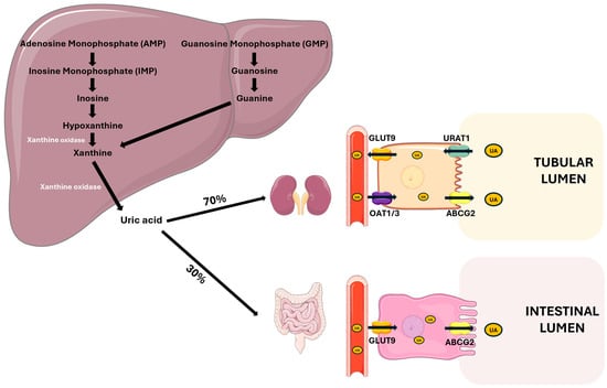 The kidneys are responsible for the majority of UA excretion, filtering out approximately 70% of the UA produced daily, while the remaining 30% is excreted from the intestine [4]. The kidney excretion process is complex and involves the distinct phases of glomerular filtration, tubular reabsorption, secretion, and post-secretory reabsorption. Only a minimal quantity of the filtered UA, approximately 8–12%, is excreted into the urine [22]. The transporters URAT 1 (SLC22A12) and GLUT9 (SLC2A9) play key roles in UA reabsorption in the proximal tubule. URAT1 mediates UA reabsorption from the tubular lumen into epithelial cells, while GLUT9 promotes UA transport through the basolateral membrane of tubular cells [22,23].