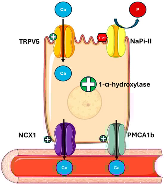 - Increasing the expression of the basolateral transporter NCX1 (sodium-calcium exchanger) and PMCA1b (plasma membrane calcium ATPase), facilitating the transfer of calcium into the bloodstream [44,45];