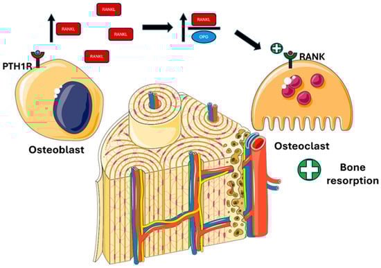 - Activating PTH1R on the osteoblastic surface stimulates RANKL (receptor activator of nuclear factor kappa-Β ligand) production and inhibits OPG (osteoprotegerin), thereby stimulating differentiation and osteoclastic activity [51].