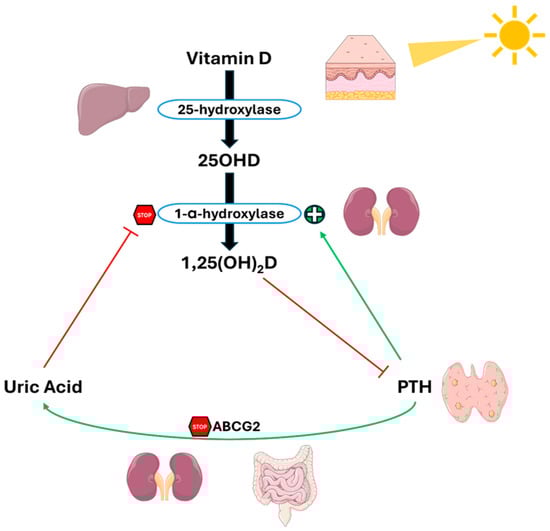 The same Thai group that conducted the meta-analysis tried to clarify the complex relationship between UA, PTH, and vitamin D, presenting a complex feedback system, as shown in Figure 5 [79]. In this context, PTH reduces UA excretion by suppressing ABCG2 expression. The subsequent increase in UA levels inhibits 1-α-hydroxylase, causing a reduction in 1,25(OH)2D levels and a consequent rise in PTH levels, thus creating a vicious cycle between hyperparathyroidism and hyperuricemia.