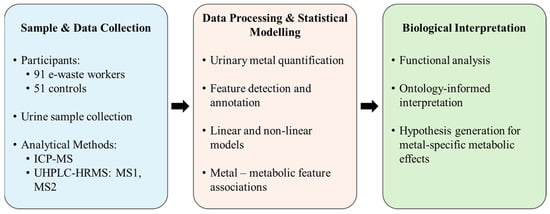 - Pang, Z.; Viau, C.; Fobil, J.N.; Basu, N.; Xia, J. Comprehensive Blood Metabolome and Exposome Analysis, Annotation, and Interpretation in E-Waste Workers. Metabolites 2024, 14, 671. [Google Scholar] [CrossRef]