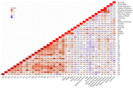 Correlation heatmap among urinary metal levels and participant characteristics.