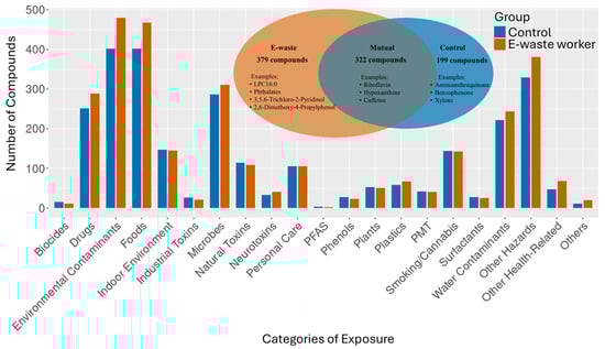 Metabolite compounds categorical profiles. The Venn diagram shows a comparison of MS2-annotated compounds detected in the e-waste worker and control groups. PFAS—per- and polyfluoroalkyl substances; PMT—persistent, mobile, and toxic substances.