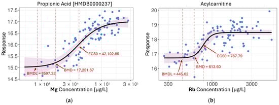 The 4PL model also revealed distinct response shapes. For instance, both Pb-nornicotine and Mg-propionic acid associations exhibited classic sigmoidal curves, while the As-taurine relationship displayed a threshold-like behaviour, where metabolite levels remained stable at low metal concentrations before rising sharply and plateauing at higher exposures. The benchmark dose (BMD) and EC50 values were also closely aligned, suggesting steep dose–response curves with minimal early response and a relatively narrow dynamic range. These patterns may reflect underlying homeostatic buffering, adaptive stress responses, or toxicodynamic saturation, all of which are biologically relevant yet challenging to detect with conventional linear modeling.