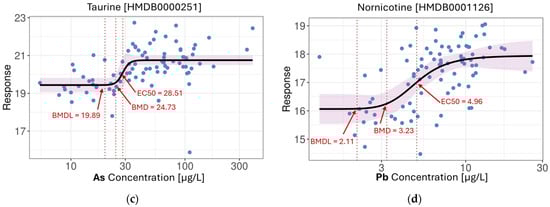 4PL nonlinear models: (a) Propionic acid in response to increasing levels of Mg; (b) Unidentified compound from the acylcarnitine group in response to increasing levels of Rb; (c) Taurine in response to increasing levels of As; (d) Nornicotine in response to increasing levels of Pb. BMD—benchmark dose; BMDL—benchmark dose lower confidence limit; EC50—half maximal effective concentration. (BMD and BMDL were reported at 10% of the full response range. Arrows and labels were added post hoc to indicate key values).