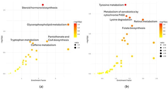 To gain biological insight into the metabolic alterations associated with metal exposure, we conducted pathway enrichment analysis using annotated and classified metabolite features. The resulting enrichment plots (Figure 5) highlight several biologically relevant pathways that were significantly overrepresented among metal-associated metabolites.