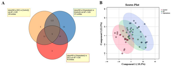 Identified metabolite features across groups. (A) The Venn diagram illustrates significant differences in metabolite features among three groups (endometrial cancer (EC) vs. Hyperplasia, endometrial cancer (EC) vs. Control, and Hyperplasia vs. Control) as determined by a one-way ANOVA with Tukey’s post hoc test, FDR p < 0.05. (B) Partial least squares discriminant analysis (PLS-DA) reveals a partial separation between these three groups.