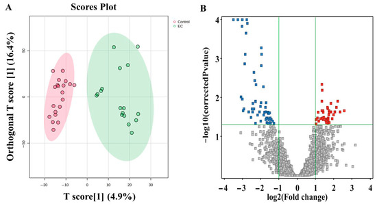 Comparing metabolomic profiles of the endometrial cancer (EC) and Control groups. (A) The OPLS-DA score plot effectively separates the endometrial cancer (EC) group from the Control group. The model’s performance was evaluated, yielding a strong fit (R2Y = 0.902) and a Q2 value of 0.51, with these values being found in a larger dataset (n = 100). (B) The volcano plot shows significantly dysregulated metabolites in EC compared to the Control group.