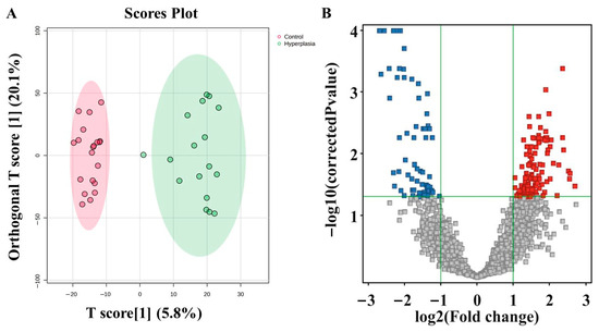 Metabolomic profiling of Hyperplasia vs. Control groups. (A) The OPLS-DA score plot illustrates the clear separation of metabolomic profiles between the hyperplasia and control groups. The robust model, validated with a larger dataset (n = 100), demonstrates strong fitness (R2Y = 0.938) and predictive ability (Q2 =0.63). (B) The volcano plot highlights significantly dysregulated metabolites in the hyperplasia group compared to the control.