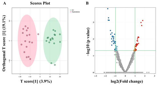 Comparison of metabolomics profiles in endometrial cancer (EC) vs. Hyperplasia (A) An orthogonal partial least squares discriminant analysis (OPLS-DA) score plot demonstrates the clear separation of the endometrial cancer (EC) and Hyperplasia groups. The model’s robustness is shown using a larger dataset (n = 100), excellent fit (R2Y = 0.917) and good predictive ability (Q2 = 0.365). (B) The volcano plot represents the significant metabolic alterations between the EC and Hyperplasia groups.