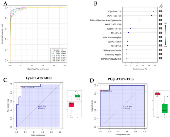 (A). Receiver Operating Characteristics (ROC) curve between EC vs. Control. (B) The frequency plot shows the significantly dysregulated endogenous metabolites between EC vs. Control. (C) The ROC curve of individual biomarker LysoPG(18:2/0:0) (AUC = 0.941) was upregulated. (D) PG(a-13:0/a-13:0) (AUC = 0.982) was downregulated in EC compared to Control. The red line indicates the optimal cutoff point for a biomarker, maximizing both sensitivity and specificity.