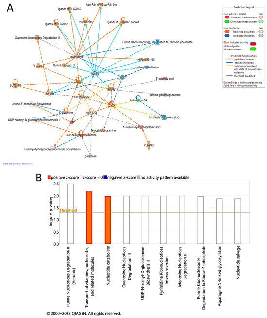 Schematic representation of the highest-scoring network pathways depicting the involvement of the differentially regulated metabolites (A) between patients with EC and Control. Nodes colored blue represent downregulation and orange represents upregulation. (B) The top canonical pathways generated through IPA (QIAGEN Inc., Hilden, Germany), ranked by the p-values. The −log (B-H) p-value threshold of 1.4 is equivalent to a Benjamini–Hochberg-corrected p-value 0.04.