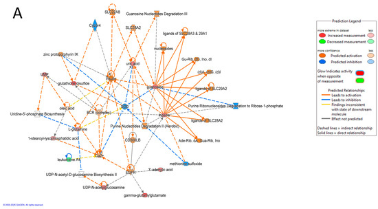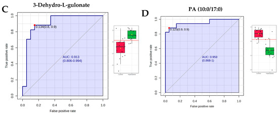 A multivariate exploratory ROC analysis was conducted using OPLS-DA as a feature-ranking and classification approach based on the identified common and significantly dysregulated metabolites between the HY and CO groups (Figure 7B). The AUC of the exploratory ROC curve for the top 10 metabolites was 0.916, as shown in Figure 7A. The frequency plot shows the significantly dysregulated endogenous metabolites between HY and CO groups. OPLS-DA was used as a classification and feature-ranking approach for the multivariate exploratory ROC analysis based on the common and significantly dysregulated metabolites identified between the HY and CO groups (Figure 7B).Of the top 15 metabolites, 2 metabolites, 3-Dehyro-L-gluconate (AUC = 0.913), whose expression was upregulated, and PA (10:0/17:0) (AUC = 0.959), whose expression was downregulated in the HY group, are shown in Figure 7C,D. Box and whisker plots for 3-Dehyro-L-gluconate are shown in Figure 7C. The green box indicates the HY groups, and the red box indicates the CO group, with an FDR p ≤ 0.05 and a fold change ≥1.5. Box, and whisker plots for PA (10:0/17:0) are shown in Figure 7D, with a fold change ≥1.5 and FDR p ≤ 0.05; the green box denotes the HY group, and the red box denotes the CO group. Additionally, the IPA identified inflammatory disease, inflammatory response, and organismal injury as the network pathways affected with the highest score between HY and CO groups (score of 35) (Figure 8A,B). The top canonical pathways included transport of vitamins, nucleosides and related molecules and nucleotide catabolism.