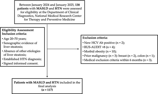 Between January 2024 and January 2025, 138 patients diagnosed with MASLD and HTN who met this study’s inclusion criteria were evaluated at the Department of Clinical Diagnostics, National Medical Research Center for Therapy and Preventive Medicine.