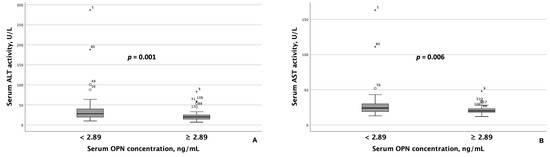 Patients with MASLD and HTN with serum OPN concentrations ≥ 2.89 ng/mL exhibited significantly lower serum ALT (A) and AST (B) activity compared to those with serum OPN concentrations < 2.89 ng/mL. Note: the central line within each box represents the median, and the box height represents the interquartile range. The whiskers depict the minimum and maximum values, and outliers are indicated by circles and asterisks. Comparisons were performed using the Mann–Whitney U test. Abbreviations: ALT, alanine transaminase; AST, aspartate aminotransferase; OPN, osteopontin.
