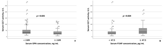 Patients with MASLD and HTN exhibiting serum OPN concentrations < 2.89 ng/mL had significantly higher AST and ALT activity than those with concentrations ≥ 2.89 ng/mL (Figure 2). Similarly, GGT activity was significantly higher among patients with lower serum OPN concentrations (Figure 3A). Although ALT and AST activity did not significantly differ between patients with serum P1NP concentrations < 47.5 pg/mL and ≥47.5 pg/mL, serum GGT activity was significantly higher among patients with MASLD and HTN and serum P1NP concentrations ≥ 47.5 pg/mL (Figure 3B).