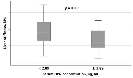 Patients with MASLD and HTN with serum OPN levels ≥ 2.89 ng/mL exhibited significantly lower liver stiffness values compared to those with serum OPN concentrations < 2.89 ng/mL. Note: the central line within each box represents the median, and the box height represents the interquartile range. The whiskers depict the minimum and maximum values, and outliers are indicated by circles and asterisks. Comparisons were performed using the Mann–Whitney U test. Abbreviations: OPN, osteopontin.