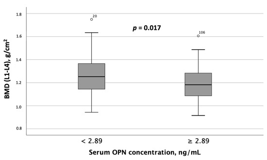 - Fodor, D.; Bondor, C.; Albu, A.; Simon, S.; Craciun, A.; Muntean, L. The Value of Osteopontin in the Assessment of Bone Mineral Density Status in Postmenopausal Women. J. Investig. Med. 2013, 61, 15–21. [Google Scholar] [CrossRef]
