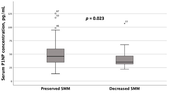 Unlike OPN, subgroups with serum P1NP concentrations < 47.5 pg/mL and ≥47.5 pg/mL did not exhibit statistically significant differences in liver stiffness values or BMD at the spine or hip. However, patients with MASLD and HTN diagnosed with reduced SMM based on ALM/W index values had significantly lower serum P1NP concentrations compared to those with preserved SMM, as determined by DEXA (Figure 6). Serum OPN concentrations also showed a trend toward being lower in patients with decreased ALM/W index values, although this difference did not reach statistical significance (p = 0.060).