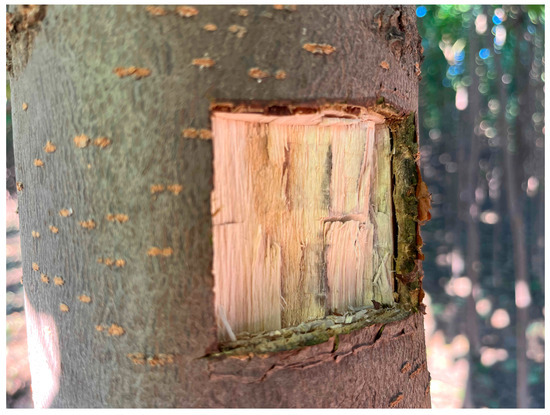 - Guo, P.P.; Zhao, X.P.; Yang, Z.F.; Wang, Y.X.; Li, H.Y.; Zhang, L.P. Water, starch, and nuclear behavior in ray parenchyma during heartwood formation of Catalpa bungei ‘Jinsi’. Heliyon 2024, 10, e27231. [Google Scholar] [CrossRef]
