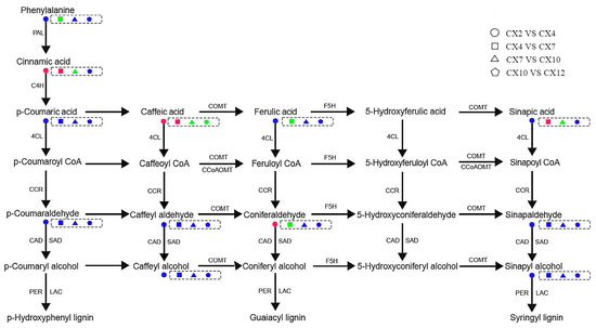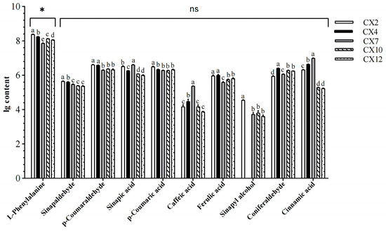 | CX2 vs. CX12 | 5 | coniferaldehyde | L-phenylalanine, cinnamic acid, sinapic acid, sinapyl alcohol |