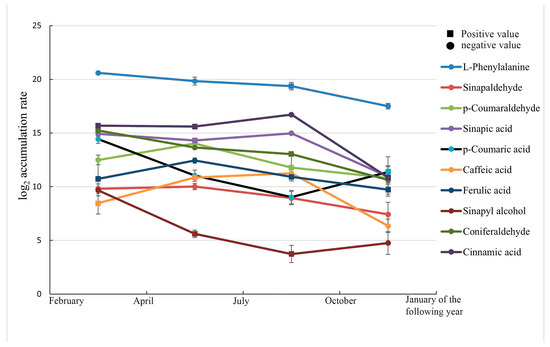 Annual Dynamic Changes in Lignin Synthesis Metabolites in Catalpa bungei ‘Jinsi’