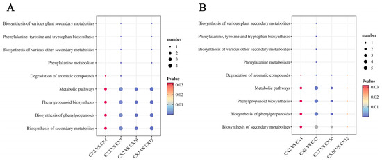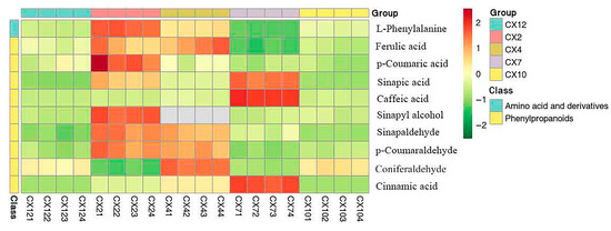 | CX4 vs. CX7 | 6 | sinapic acid, caffeic acid, cinnamic acid | L-phenylalanine, ferulic acid, coniferaldehyde |