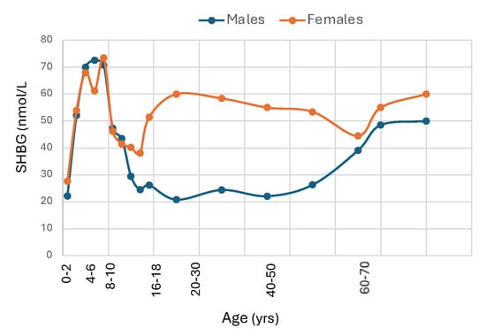 The SHBG gene is expressed in the placenta []. SHBG is present in cord blood, which is of fetal origin, in which levels are much lower than in maternal blood, and most studies have found similar levels in males and females [,,]. As illustrated in Figure 2, cross-sectional data suggest that SHBG concentrations increase markedly after birth into early childhood [,] and reach peak around 3 months of age []. While the explanation for this increase is uncertain, the concordant rise in T3 levels, which is known to stimulate SHBG production, and lower levels in hypothyroid infants [] support the idea that the postnatal rise in SHBG is at least partly thyroid hormone-dependent. One idea is that the rise in SHBG serves to lower testosterone bioactivity in infant boys through childhood, as proposed by Hammond []. In support of this idea, the level of salivary testosterone, a surrogate for free testosterone, is much higher in newborn boys with lower SHBG levels than in minipuberty although total testosterone levels are similar [,]. During childhood, SHBG levels remain relatively high and stable, but begin to decline gradually [] as puberty approaches, more prominently in boys than in girls [], to reach nadir values in young adulthood []. Although the decline in boys is partly from androgens [], a comparable decline in boys with idiopathic hypopituitarism [] or with isolated hypogonadotropic hypogonadism or complete androgen insensitivity [] suggests that metabolic rather than neuroendocrine signals are the main driver of the late childhood decline in SHBG.