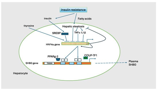 Thus, as diagrammed in Figure 4, there is substantial evidence that hyperinsulinemia and excess hepatic fat are key determinants of low SHBG levels in patients with IR [].