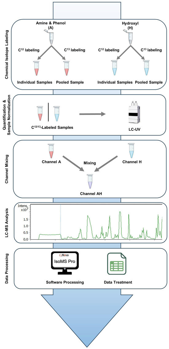 - Zhao, S.; Luo, X.; Li, L. Chemical Isotope Labeling LC-MS for High Coverage and Quantitative Profiling of the Hydroxyl Submetabolome in Metabolomics. Anal. Chem. 2016, 88, 10617–10623. [Google Scholar] [CrossRef] [PubMed]