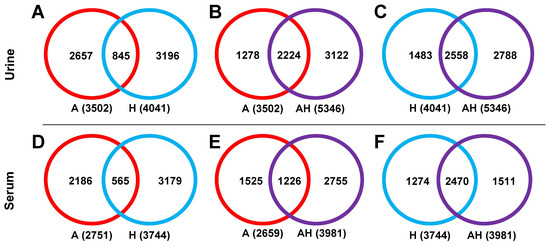 Venn diagrams illustrating the number of detected peak pairs in the A channel (red), H channel (blue), and AH mixture (purple) for urine (A–C) and serum (D–F) samples. In each channel, a labeled metabolite is detected as a co-eluting 12C/13C-labeled ion pair (i.e., peak pair) that exhibits the expected mass difference of 2.0067 Da. Overlapping and unique peak pairs were determined by comparing m/z and retention time across different channels. A peak pair was considered overlapping if both m/z and retention time matched within a defined tolerance window.