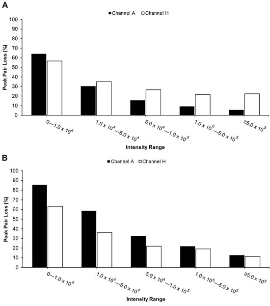For urine samples, peak pair losses of the A channel were lower compared to the H channel in most of the intensity ranges, except for the lowest range (Figure 3A), suggesting that amine-/phenol-containing metabolites were better preserved during mixing. In contrast, serum samples displayed higher peak pair loss in the A channel compared to the H channel (Figure 3B), indicating a distinct detection preference depending on sample type and intensity region.