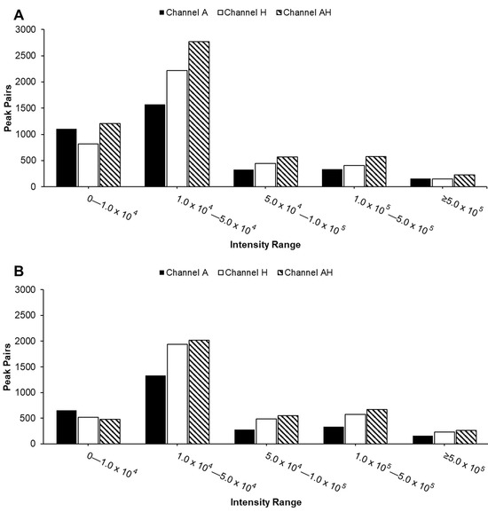The AH mixture captured 2224 peak pairs from the A channel (63.5% coverage, Figure 2B) and 2558 peak pairs (63.3% coverage, Figure 2C) from the H channel. Similar results were observed for serum samples: 2751 peak pairs were detected in the A channel and 3744 in the H channel, with 80% of peak pairs being unique to each channel (Figure 2D). The AH mixture retained 1226 peak pairs from the A channel (46.1% coverage, Figure 2E) and 2470 from the H channel (66.0% coverage, Figure 2F).