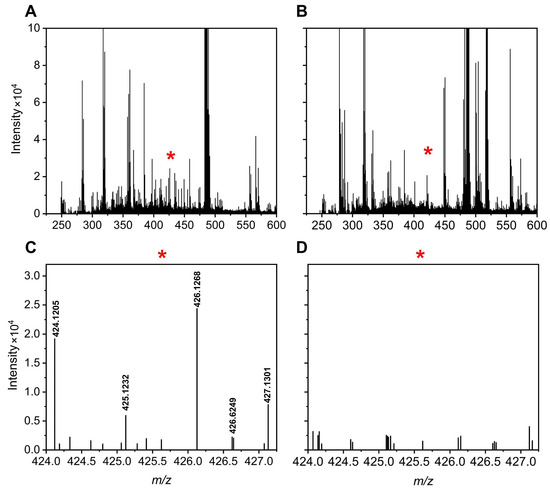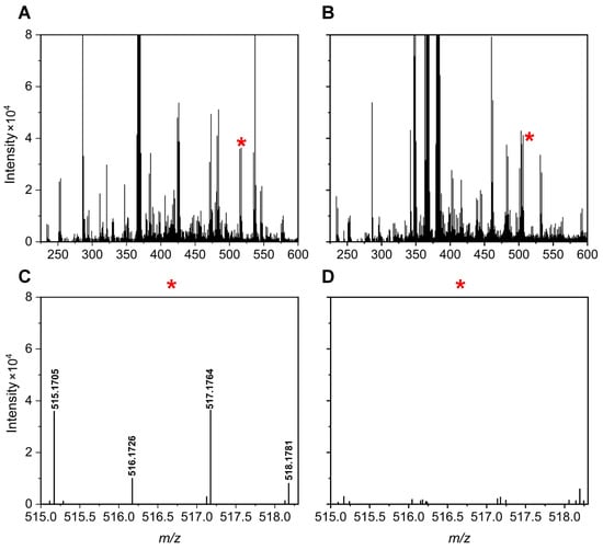 Mass spectra of a urine sample at 8.01 min for the H channel (A) and AH mixture (B). A region with peak pair loss is marked by a red * and enlarged for clarity: H channel enhanced (C) and AH mixture enhanced (D).