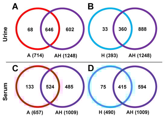 Venn diagram showing the number of identified metabolites in the A channel (red), H channel (blue), and AH mixture (purple) for urine (A,B) and serum (C,D) samples.
