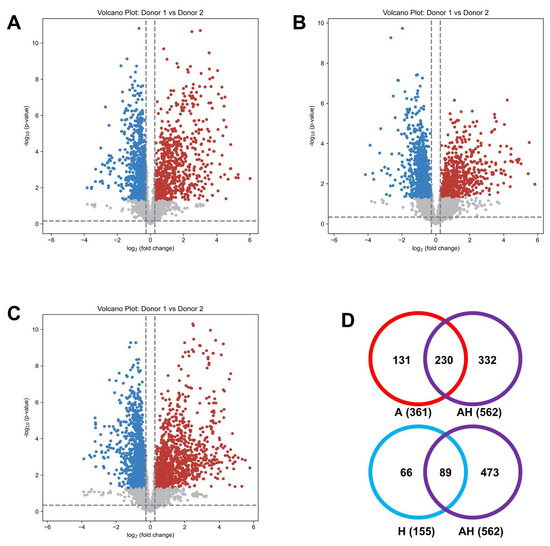 Volcano plots of binary comparisons of urine samples from two independent donors (Donor 1, Blue ; Donor 2, Red) for the A channel (A), H channel (B), and AH mixture (C). Venn diagram (D) illustrating the overlap of significantly changed metabolites (tier 1 and tier 2 only) among the A (red), H (blue), and AH (purple) channels.