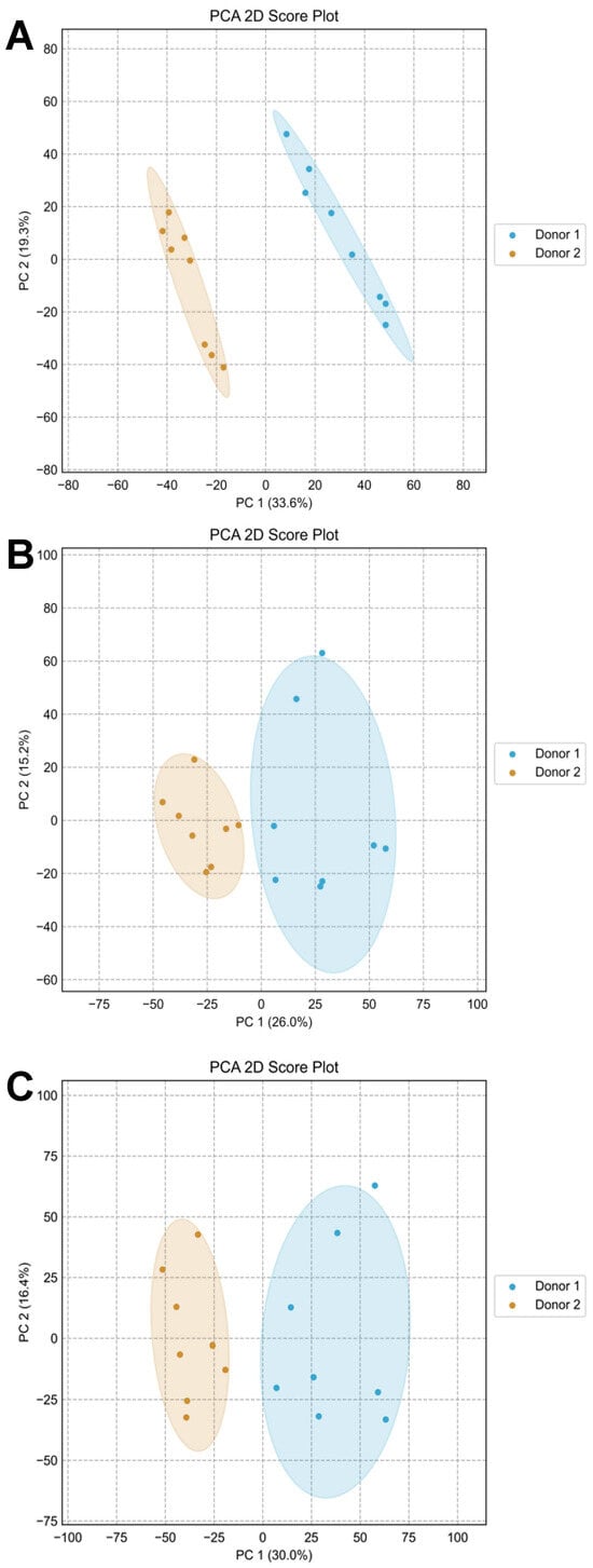 Principal Component Analysis (PCA) was conducted to visually examine the distribution of the 16 samples. The PCA for amine-/phenol-containing metabolites showed clear separation between the two donors, indicating distinct metabolite compositions (Figure 9A). In contrast, the PCA for hydroxyl-containing metabolites displayed slightly overlapping clusters, suggesting limited compositional differences for this metabolite subset (Figure 9B). Notably, the PCA for the AH mixture effectively integrated the unique characteristics from both A and H channels, resulting in clear separation and demonstrating successful data integration from both submetabolomes (Figure 9C).